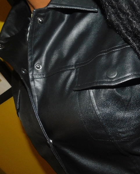 Lightweight vegan leather cropped Jacket with front trucker pockets.